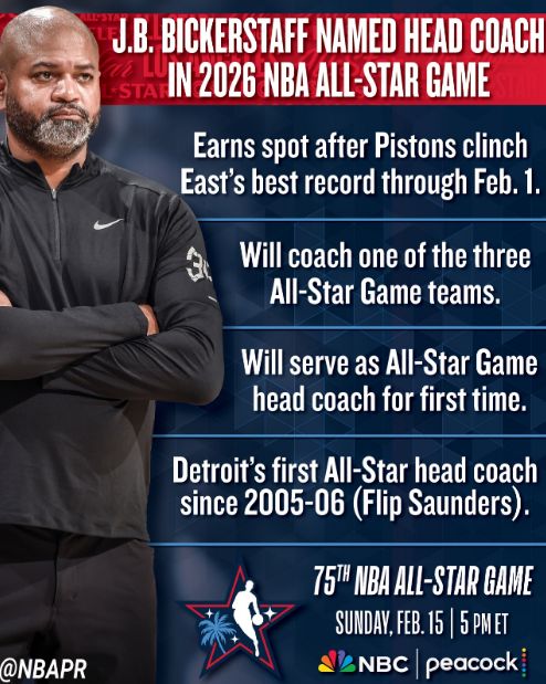 活塞官方曬出海報(bào)祝賀比克斯塔夫,同時配文寫道:“比克斯塔夫?qū)⒄綋?dān)任26年NBA全明星賽主教練!”